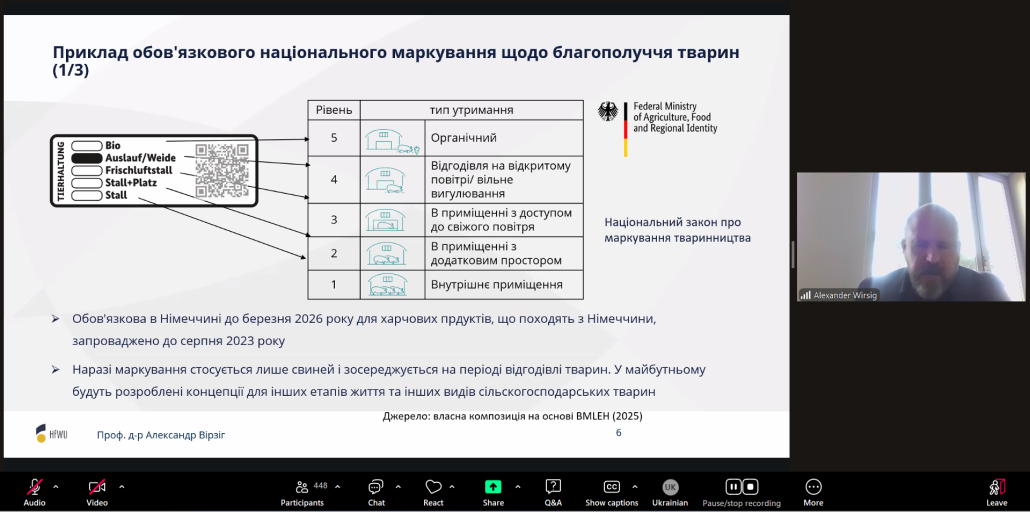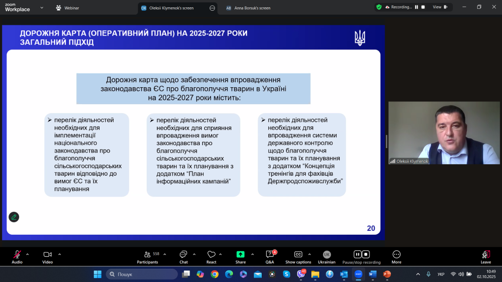 Oleksii Klymenok, Head of the Animal Health and Welfare Unit of the Directorate of Animal Health and Welfare, Organization of Anti-Epizootic Measures of the Department of Food Safety and Veterinary Medicine, SSUFSCP, analysed the current status of implementation of the official control system on farmed animals‘ welfare in Ukraine.