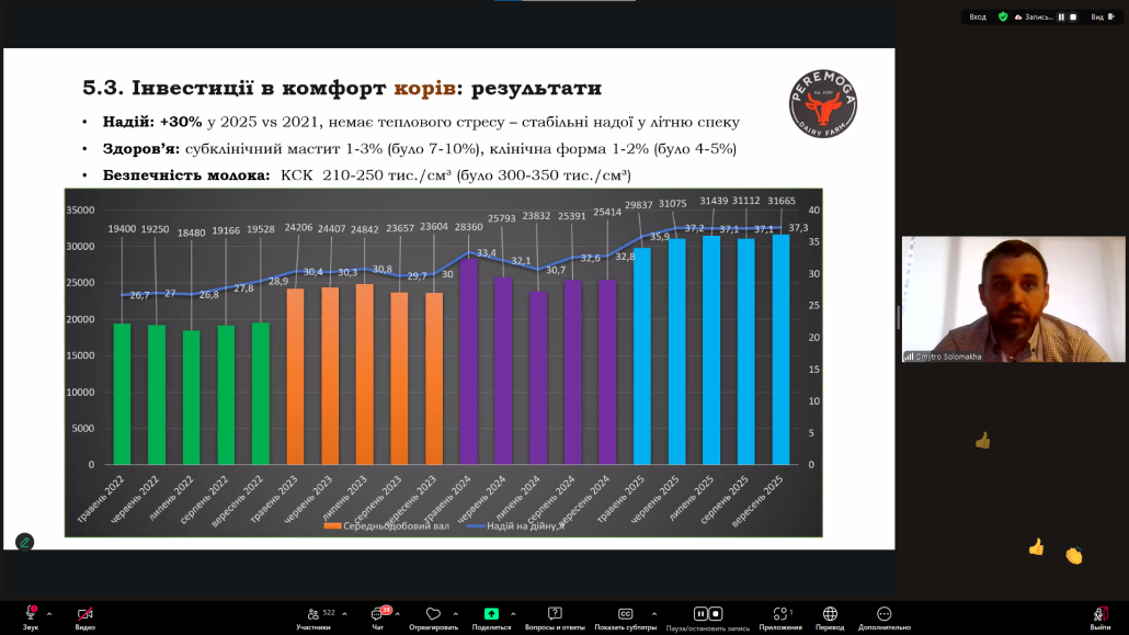 Dmytro Solomakha, Director of JSC «Peremoha», shared farm’s experience of milk production, as well as the economic results of investing in the welfare of cows and calves made after the full-scale invasion. In his presentation, he emphasized that investments in animal welfare and staff training are not only about complying with legal requirements, but also a way to improve the farm’s production efficiency and economic performance.