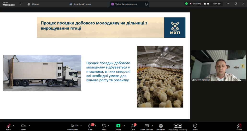 Vadym Karatnyuk, Leading zootechnician at the branch «Poultry complex», Vinnytsia Poultry Farm LLC, highlighted the specifics of implementing welfare requirements for broiler farming. He also gave examples of best practices that promote poultry health and higher productivity.