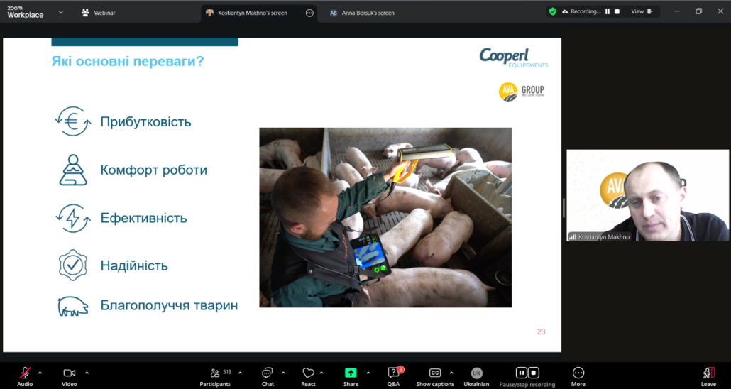 Nataliya Hrishchenko, Associate Professor of Department of Technologies in Poultry, Pig and Sheep Breeding of Faculty of Animal Husbandry and Aquatic Bioresources, NUBiP of Ukraine, analysed the main challenges faced by pig farms and justified the need to introduce transition periods for legislative requirements. Konstantin Makhno, Innovation Manager at AVA Group, presented innovative solutions for pig farming that will help to ensure that animal welfare requirements are met.