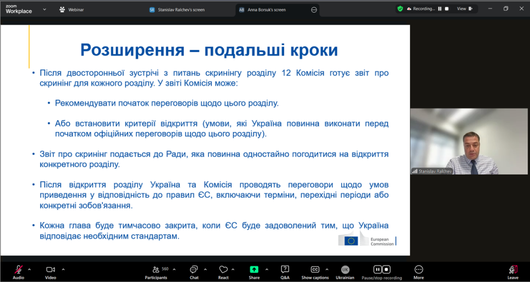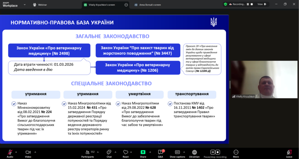 Vitalii Kryuchkov, Head of the Animal Health and Welfare Division of the Sanitary and Phytosanitary Measures Directorate, Department of State Policy on Sanitary and Phytosanitary Measures and Food Safety of the Ministry of Economy, presented the status of harmonisation of national legislation regarding the welfare of farmed animals to EU requirements.