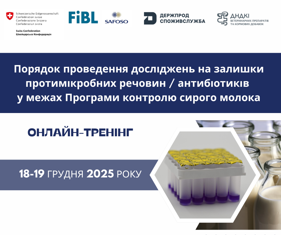 18-19 грудня відбудеться онлайн-тренінг «Порядок проведення досліджень на залишки протимікробних речовин / антибіотиків у межах Програми контролю сирого молока», що проводить Державний науково-дослідний контрольний інститут ветеринарних препаратів та кормових добавок.