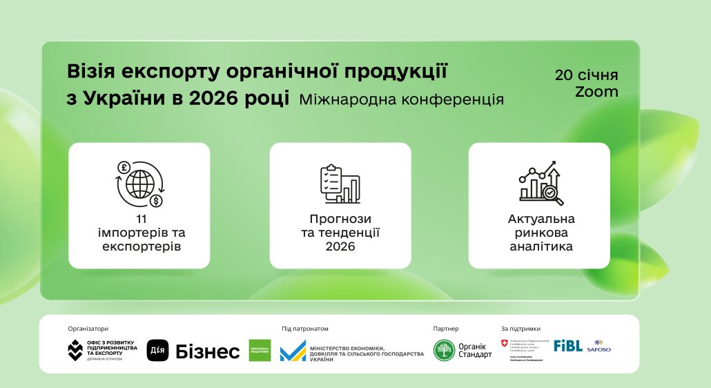 20 січня 2026 року відбулася міжнародна онлайн-конференція «Візія експорту органічної продукції з України в 2026 році», яка об’єднала ключових гравців органічного сектору навколо спільного бачення розвитку експорту в умовах війни. Захід став практичною платформою для обговорення ключових тенденцій ринку, знайомства з практичним кейсам та інструментам розвитку експорту органічної продукції з України.