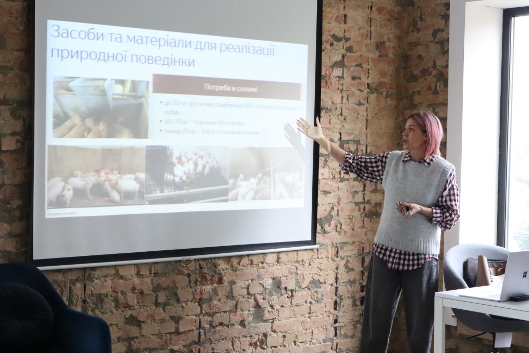 На потужності з вирощування свиней Оксана Юрченко, незалежний експерт з питань благополуччя свиней, детально розповіла про вимоги законодавства до благополуччя свиней під час їх утримання, а також основні індикатори для перевірки дотримання цих вимог операторами ринку. Учасники мали змогу відразу практично відпрацювати отримані знання під час симуляційного інспектування для фактичної оцінки рівня благополуччя, використовуючи сучасні методи візуалізації утримання свиней.